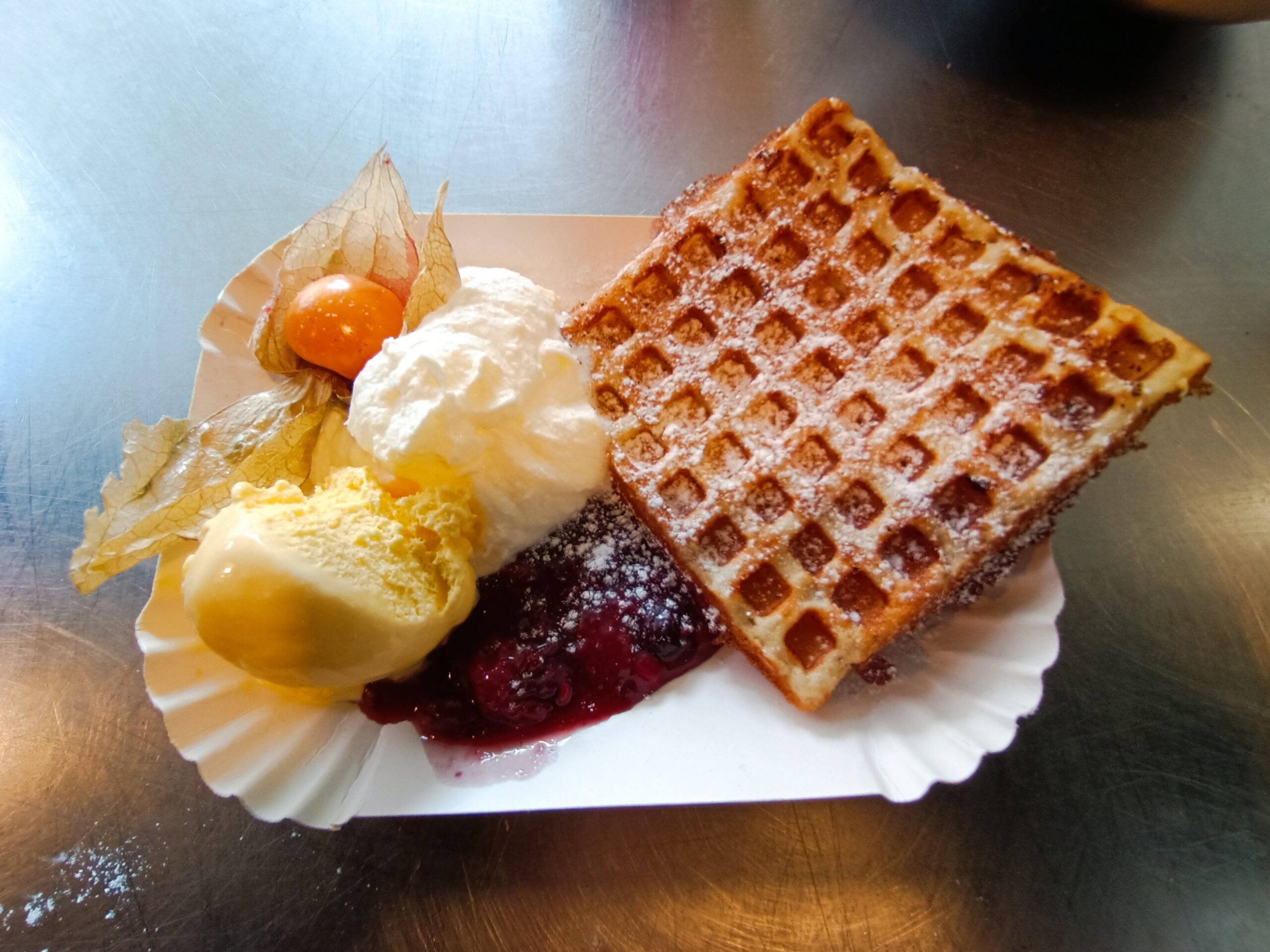 sehr beliebt als Dessert: frische Waffel mit Beeren und Eis