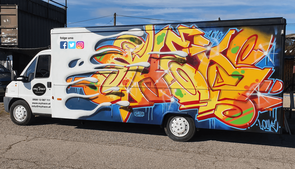 Die Außenhülle des Trucks wurde 2020 von „Shed“ (Erich Willner) mit einem klassischen Wildstyle- Graffiti geschmückt. Streetfood meets Streetart!